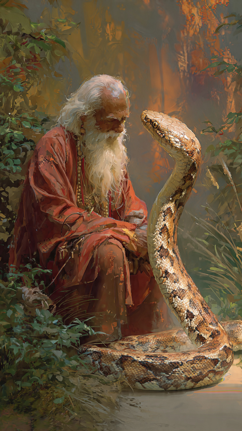 One day a holy man was passing by and noticed the snake rushing towards him to bite. He remained calm and looked at the snake and smiled.